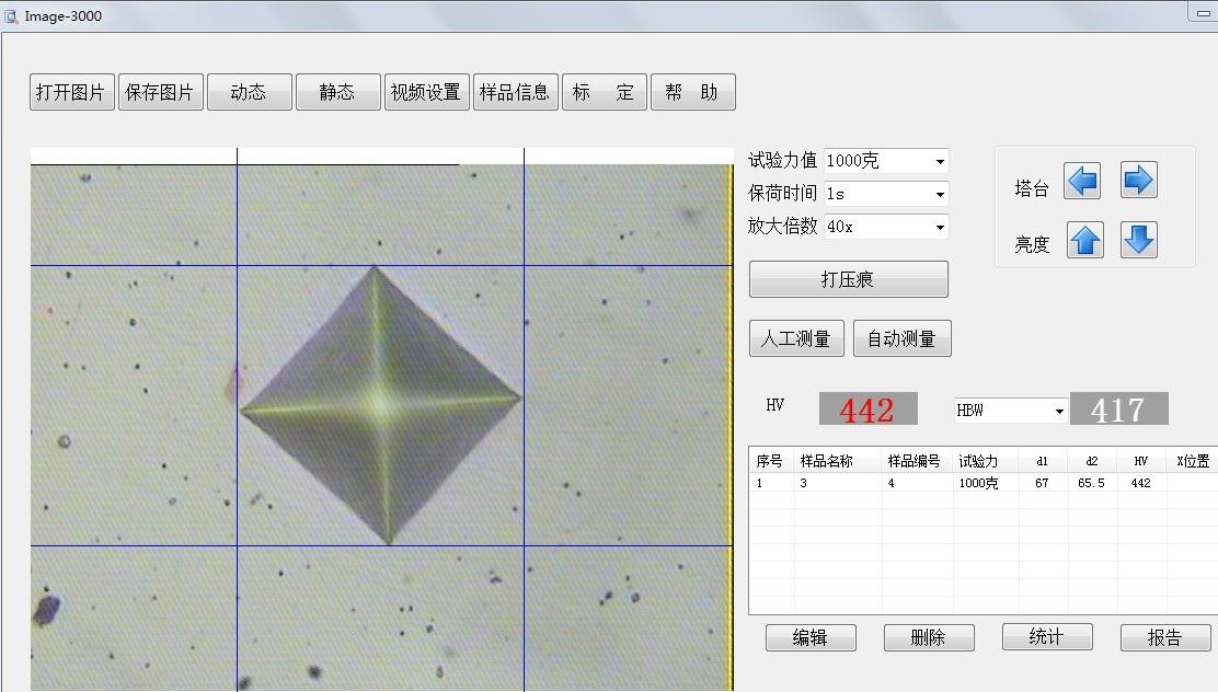 首先打開(kāi)開(kāi)關(guān),放上試驗(yàn)塊,打開(kāi)光源,四向箭頭按向上箭頭,增加亮度,向上搖動(dòng)調(diào)焦轉(zhuǎn)把,將試驗(yàn)塊和物鏡距離大約2毫米??梢钥辞逦飰K表面,按下START(開(kāi)始,測(cè)試)按鍵,物鏡會(huì)轉(zhuǎn)移成金剛石壓頭,然后金剛石壓頭向下 進(jìn)行 加荷,保荷,卸荷 操作 (大約時(shí)間是在10~15秒) 然后,金剛石壓頭會(huì)轉(zhuǎn)成物鏡,目鏡為10倍物鏡為40倍,另一物鏡為觀察使用物鏡為20倍,